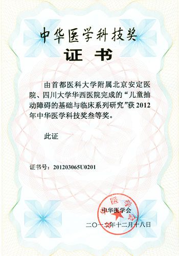 我國醫(yī)藥衛(wèi)生行業(yè)最高科技獎,中華醫(yī)學(xué)科技獎(2011-2012)頒獎大會于2013年1月28日在北京國家會議中心舉行。衛(wèi)生部部長、中華醫(yī)學(xué)會會長陳竺出席并講話。我院鄭毅教授率領(lǐng)的兒科團隊《兒童抽動障礙基礎(chǔ)與臨床系列研究》(201203065)榮獲三等獎,這是全國精神科領(lǐng)域的唯一殊榮。